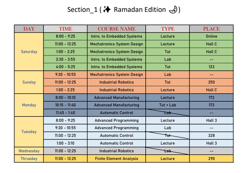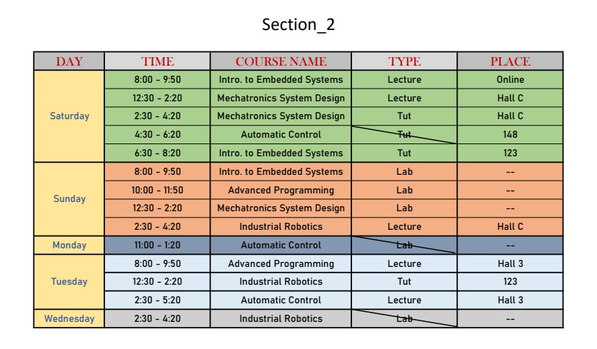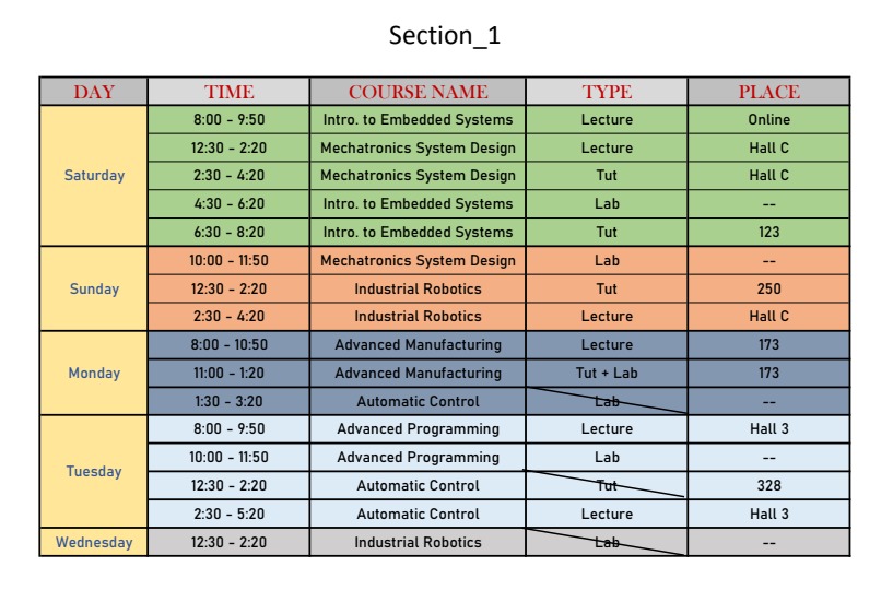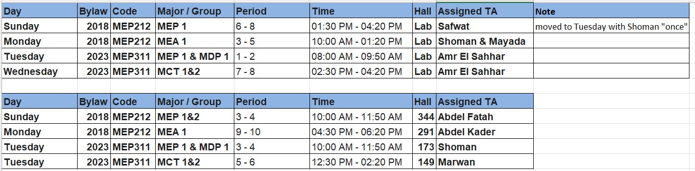 | Sunday | 2018 | MEP212 | MEP 1 | 6 - 8 | 01:30 PM - 04:20 PM | Lab | Safwat | moved to Tuesday with Shoman |