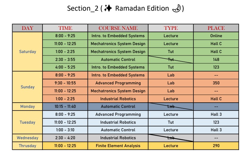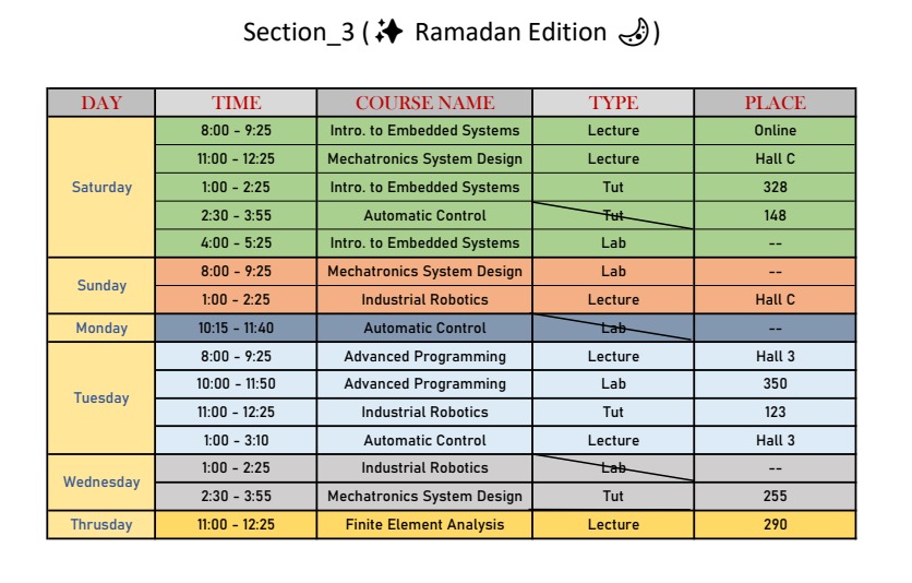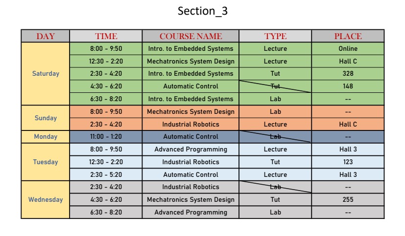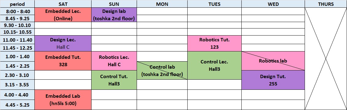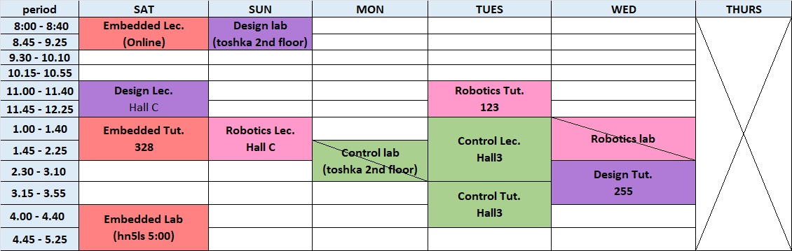 | Day | Bylaw | Code | Major / Group | Period | Time | Hall | Assigned TA | Note |
